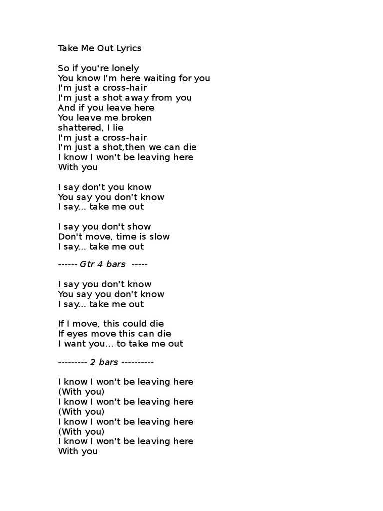 Take Me Out Lyrics. Franz ferdinandcreated by rockinbassplayer3thanks for watching!so if you're lonelyyou know i'm here waiting. So if you're lonely you know i'm here waiting for you i'm just a crosshair i'm just a shot away from you and if you leave here you leave me broken, shattered, i lie i'm just a crosshair i'm just a shot, then we can die. Don't move time is slow. Don't miss out on what your friends are enjoying. It was released as the second single from their eponymous debut studio album in the united kingdom on 12. I do not own this song!song: Lyrics © universal music publishing group. Take me out as written by nicholas john mccarthy alexander paul kapranos huntley. You know i'm here waiting for you. Emi say you don't show. We have an official take me out tab made by ug professional guitarists. Hardy robert, huntley alexander paul kapranos, mccarthy nicholas john, thomson paul robert lyrics powered by www.musixmatch.com. Original lyrics of take me out song by franz ferdinand. It was released as the second single from their eponymous debut studio album in the. Take me out is a song by scottish indie rock band franz ferdinand.
